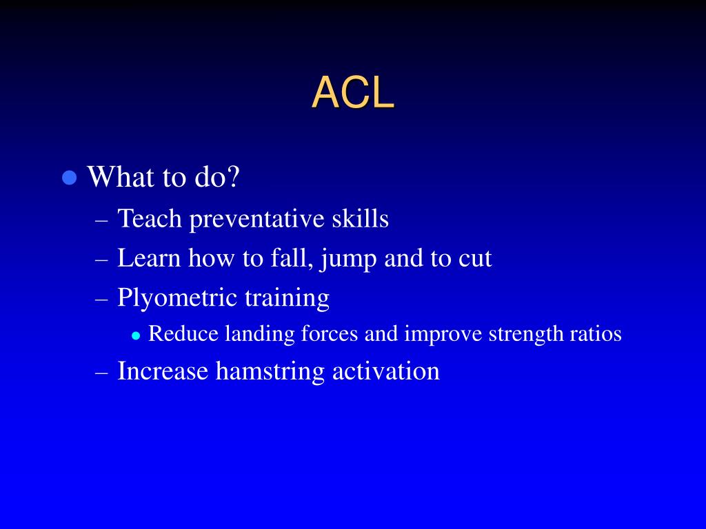 ACL • What to do? • Teach preventative skills • Learn how to fall, jump and to cut • Plyometric training • Reduce landing forces and improve strength ratios • Increase hamstring activation
