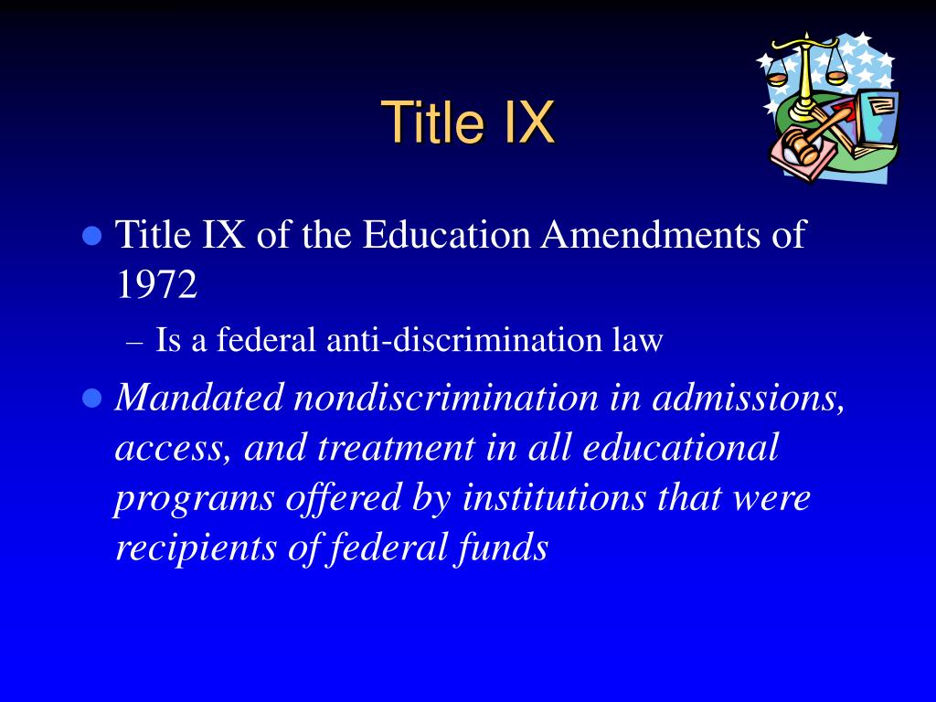 Title IX • Title IX of the Education Amendments of 1972 • Is a federal anti-discrimination law • Mandated nondiscrimination in admissions, access, and treatment in all educational programs offered by institutions that were recipients of federal funds