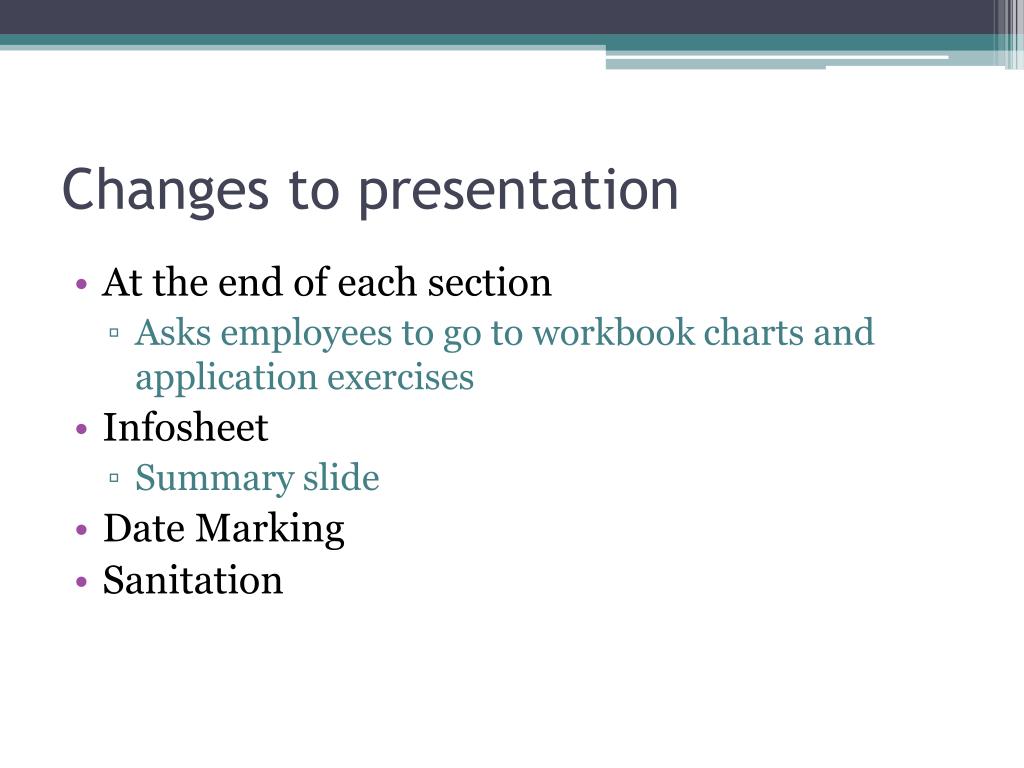 Changes to presentation • At the end of each section • Asks employees to go to workbook charts and application exercises • Infosheet • Summary slide • Date Marking • Sanitation