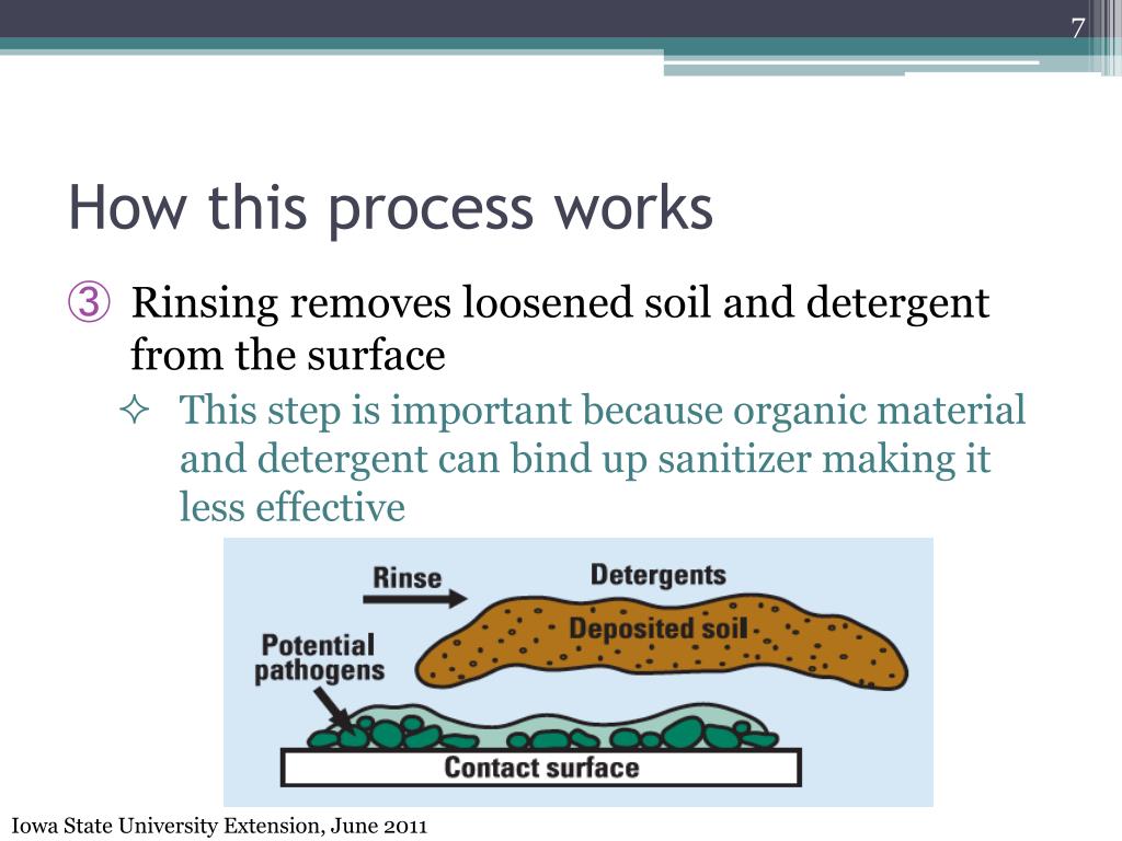 How this process works • Rinsing removes loosened soil and detergent from the surface • This step is important because organic material and detergent can bind up sanitizer making it less effective Iowa State University Extension, June 2011