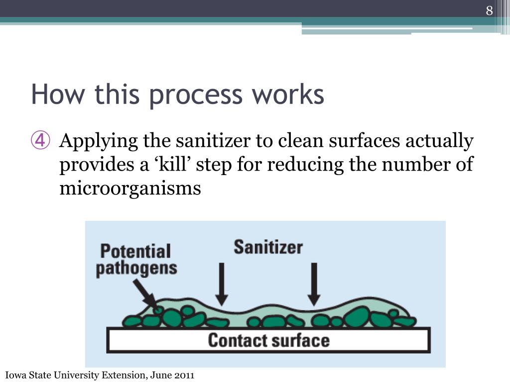 How this process works • Applying the sanitizer to clean surfaces actually provides a ‘kill’ step for reducing the number of microorganisms Iowa State University Extension, June 2011