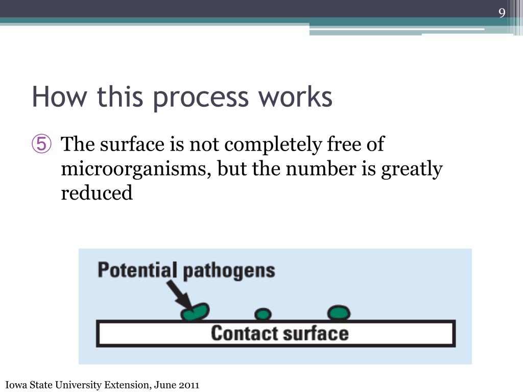 How this process works • Washing helps loosen soils and other organic matter from the surface • Detergent and scrubbing also helps break the adhesion of microorganisms to the surface Iowa State University Extension, June 2011