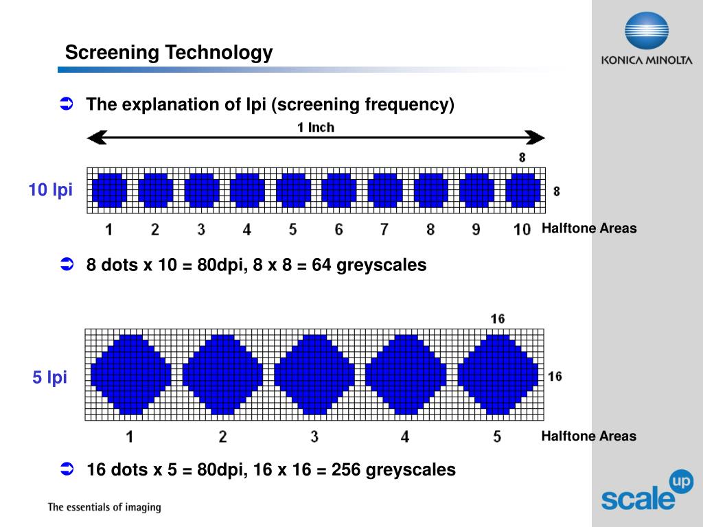 Screening Technology • The explanation of lpi (screening frequency) 10 lpi Halftone Areas • 8 dots x 10 = 80dpi, 8 x 8 = 64 greyscales 5 lpi Halftone Areas • 16 dots x 5 = 80dpi, 16 x 16 = 256 greyscales