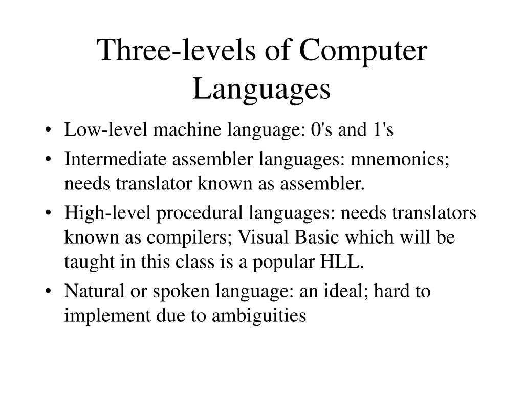 Three-levels of Computer Languages • Low-level machine language: 0's and 1's • Intermediate assembler languages: mnemonics; needs translator known as assembler. • High-level procedural languages: needs translators known as compilers; Visual Basic which will be taught in this class is a popular HLL. • Natural or spoken language: an ideal; hard to implement due to ambiguities