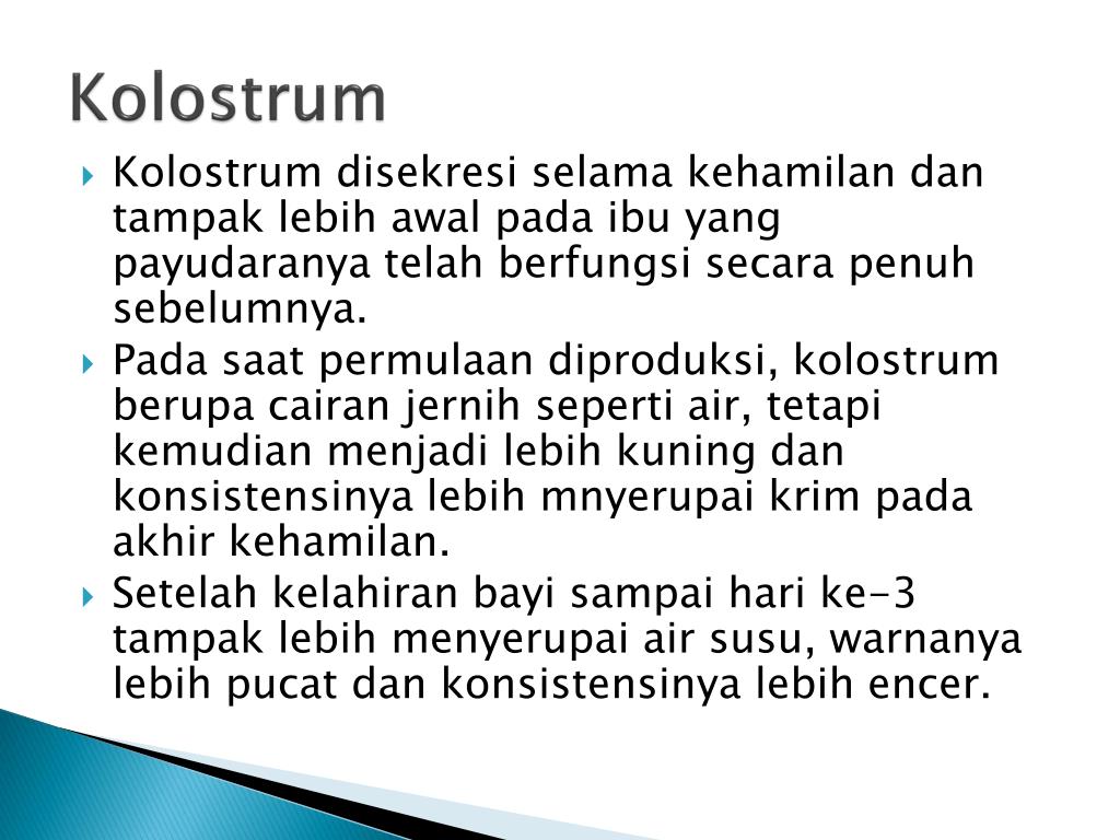 Kolostrum • Kolostrumdisekresiselamakehamilandantampaklebihawalpadaibu yang payudaranyatelahberfungsisecarapenuhsebelumnya. • Padasaatpermulaandiproduksi, kolostrumberupacairanjernihseperti air, tetapikemudianmenjadilebihkuningdankonsistensinyalebihmnyerupaikrimpadaakhirkehamilan. • Setelahkelahiranbayisampaihari ke-3 tampaklebihmenyerupai air susu, warnanyalebihpucatdankonsistensinyalebihencer.