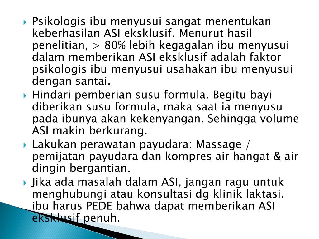 Psikologisibumenyusuisangatmenentukankeberhasilan ASI eksklusif. Menuruthasilpenelitian, > 80% lebihkegagalanibumenyusuidalammemberikan ASI eksklusifadalahfaktorpsikologisibumenyusuiusahakanibumenyusuidengansantai. • Hindaripemberiansusu formula. Begitubayidiberikansusu formula, makasaatiamenyusupadaibunyaakankekenyangan. Sehingga volume ASI makinberkurang. • Lakukanperawatanpayudara: Massage / pemijatanpayudaradankompres air hangat & air dinginbergantian. • Jikaadamasalahdalam ASI, janganraguuntukmenghubungiataukonsultasi dg kliniklaktasi. ibuharus PEDE bahwadapatmemberikan ASI eksklusifpenuh.