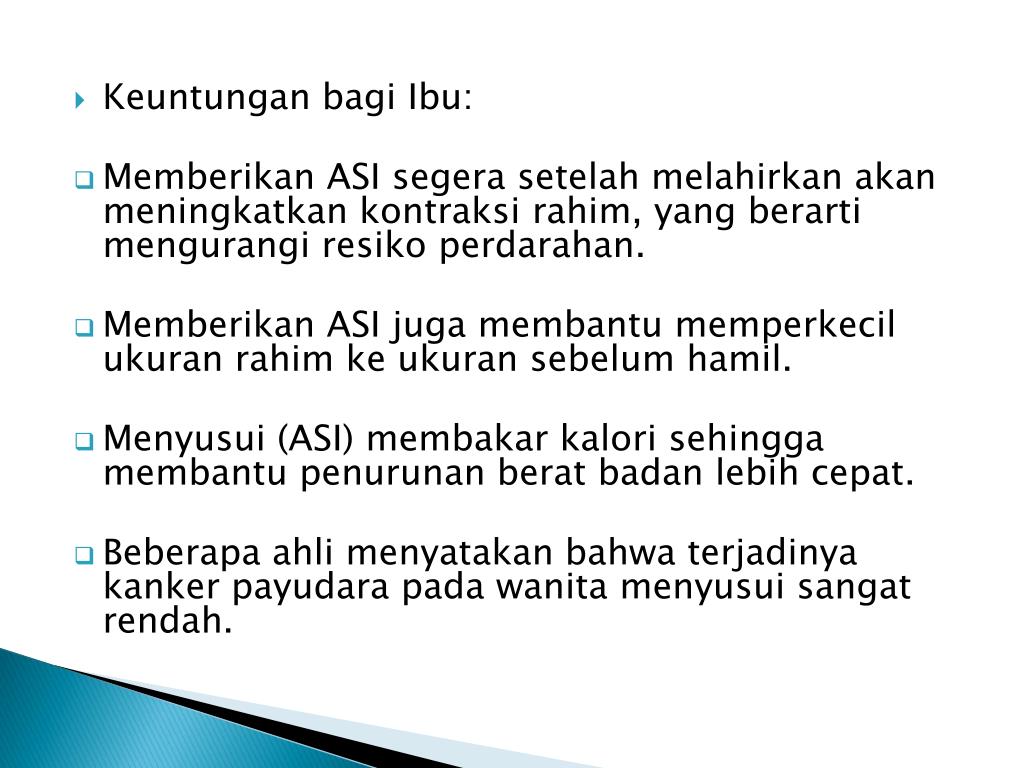 KeuntunganbagiIbu: • Memberikan ASI segerasetelahmelahirkanakanmeningkatkankontraksirahim, yang berartimengurangiresikoperdarahan. • Memberikan ASI jugamembantumemperkecilukuranrahimkeukuransebelumhamil. • Menyusui (ASI) membakarkalorisehinggamembantupenurunanberatbadanlebihcepat. • Beberapaahlimenyatakanbahwaterjadinyakankerpayudarapadawanitamenyusuisangatrendah.