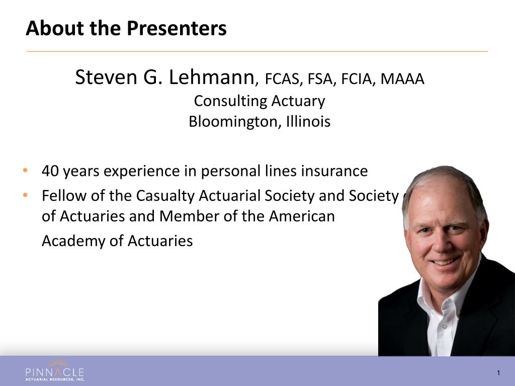 About the Presenters Steven G. Lehmann,FCAS, FSA, FCIA, MAAAConsulting ActuaryBloomington, Illinois • 40 years experience in personal lines insurance • Fellow of the Casualty Actuarial Society and Society of ofof of Actuaries and Member of the American Academy of Actuaries