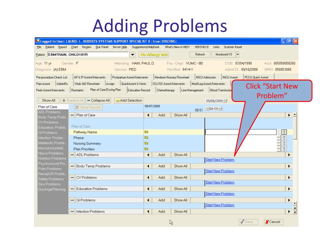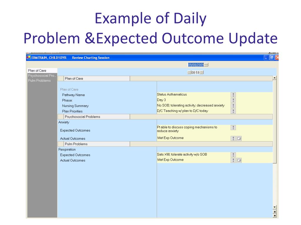 If there are more than 4 Active problems … 3-4 most significant Problems will be focus at any point in time. Use significant flag for the Expected Outcomes to denote these if there are > 4 active problems Lower priority Problem will not be significant focus at present time Document against significant priority Problems at least once each 24 hrs. In this example, you’d chart against Problems circled in green but not against those circled in red.