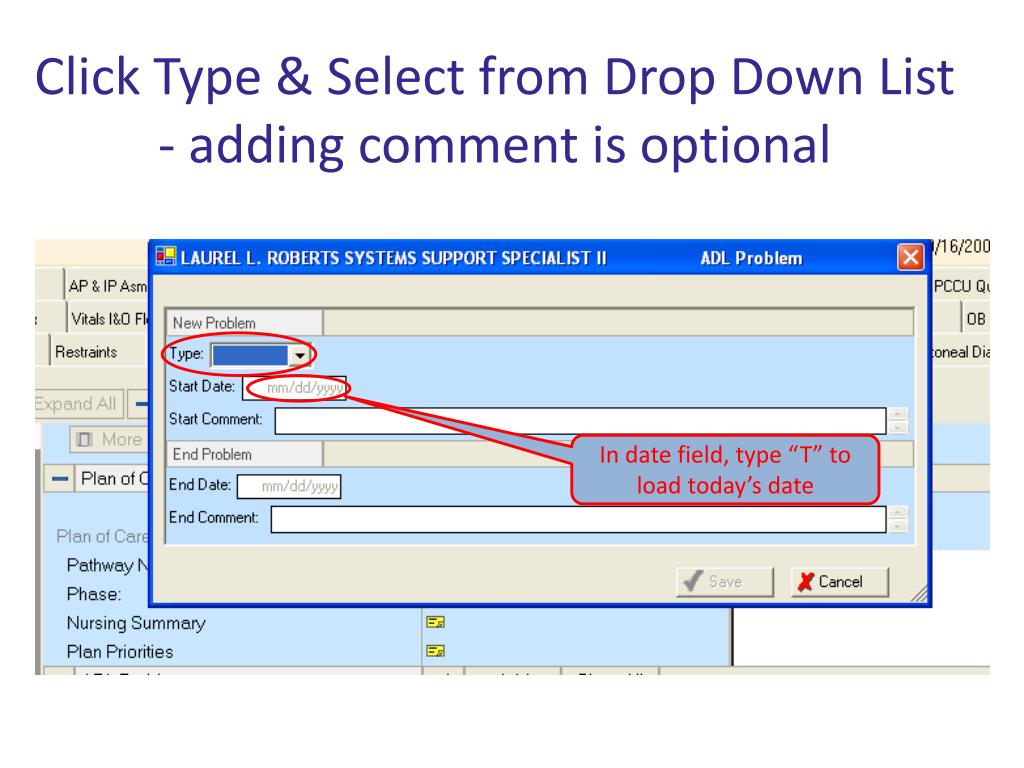 Click Type & Select from Drop Down List- adding comment is optional In date field, type “T” to load today’s date