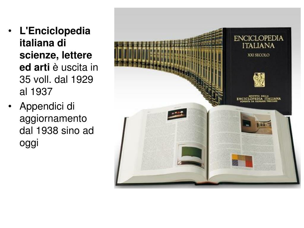 L'Enciclopedia italiana di scienze, lettere ed arti è uscita in 35 voll. dal 1929 al 1937 • Appendici di aggiornamento dal 1938 sino ad oggi