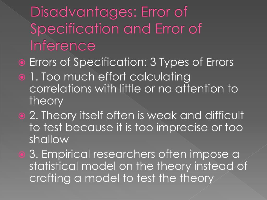 Disadvantages: Error of Specification and Error of Inference • Errors of Specification: 3 Types of Errors • 1. Too much effort calculating correlations with little or no attention to theory • 2. Theory itself often is weak and difficult to test because it is too imprecise or too shallow • 3. Empirical researchers often impose a statistical model on the theory instead of crafting a model to test the theory