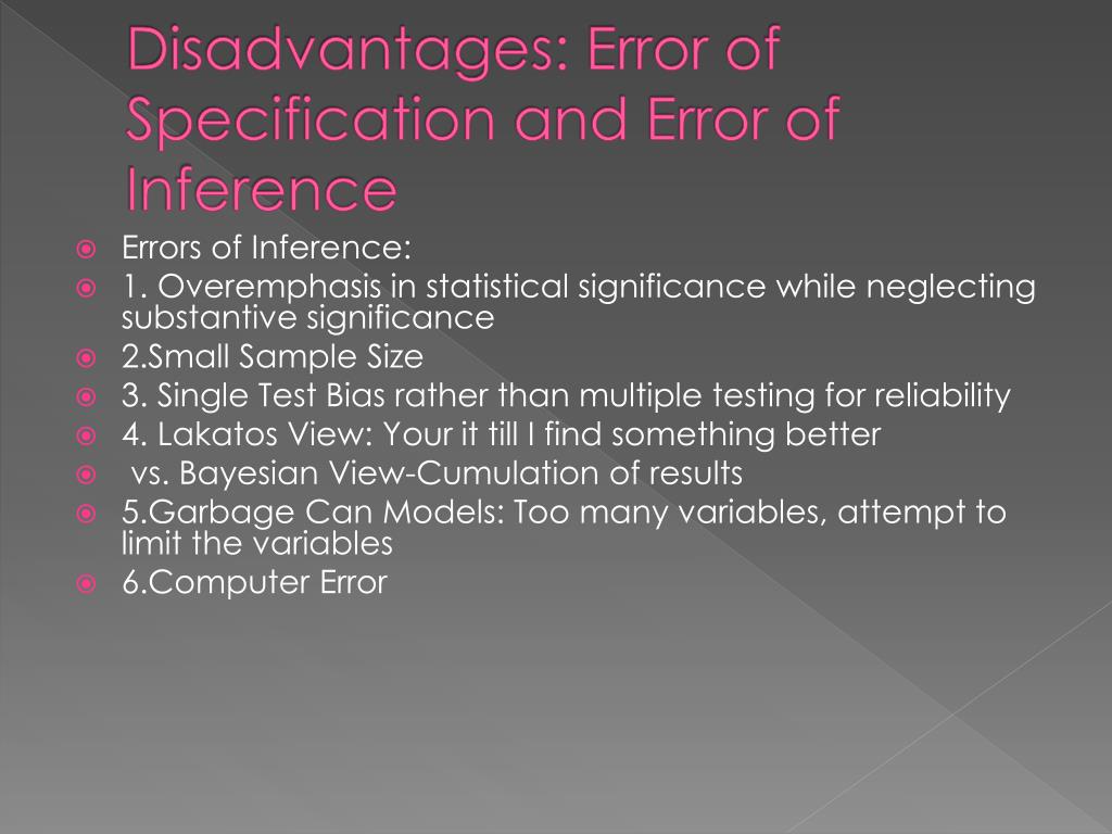 Disadvantages: Error of Specification and Error of Inference • Errors of Inference: • 1. Overemphasis in statistical significance while neglecting substantive significance • 2.Small Sample Size • 3. Single Test Bias rather than multiple testing for reliability • 4. Lakatos View: Your it till I find something better • vs. Bayesian View-Cumulation of results • 5.Garbage Can Models: Too many variables, attempt to limit the variables • 6.Computer Error