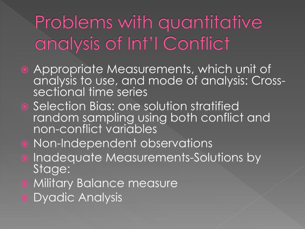 Problems with quantitative analysis of Int’l Conflict • Appropriate Measurements, which unit of analysis to use, and mode of analysis: Cross-sectional time series • Selection Bias: one solution stratified random sampling using both conflict and non-conflict variables • Non-Independent observations • Inadequate Measurements-Solutions by Stage: • Military Balance measure • Dyadic Analysis