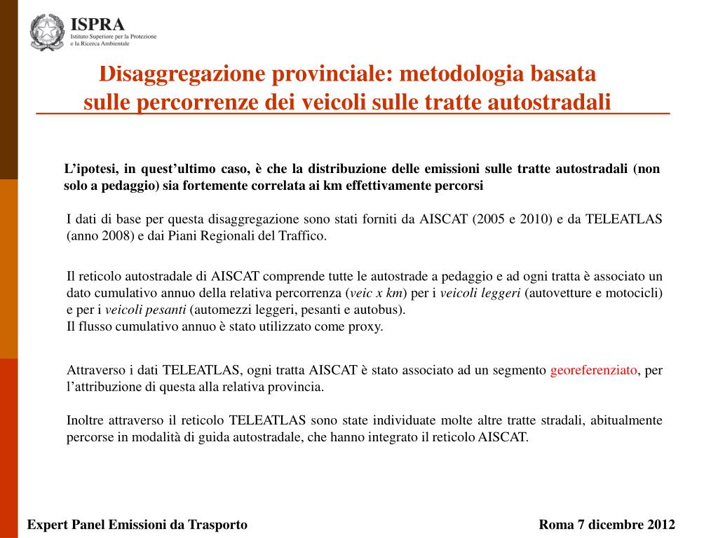 Disaggregazione provinciale: metodologia basata sulle percorrenze dei veicoli sulle tratte autostradali L’ipotesi, in quest’ultimo caso, è che la distribuzione delle emissioni sulle tratte autostradali (non solo a pedaggio) sia fortemente correlata ai km effettivamente percorsi I dati di base per questa disaggregazione sono stati forniti da AISCAT (2005 e 2010) e da TELEATLAS (anno 2008) e dai Piani Regionali del Traffico. Il reticolo autostradale di AISCAT comprende tutte le autostrade a pedaggio e ad ogni tratta è associato un dato cumulativo annuo della relativa percorrenza (veic x km) per i veicoli leggeri (autovetture e motocicli) e per i veicoli pesanti (automezzi leggeri, pesanti e autobus). Il flusso cumulativo annuo è stato utilizzato come proxy. Attraverso i dati TELEATLAS, ogni tratta AISCAT è stato associato ad un segmento georeferenziato, per l’attribuzione di questa alla relativa provincia. Inoltre attraverso il reticolo TELEATLAS sono state individuate molte altre tratte stradali, abitualmente percorse in modalità di guida autostradale, che hanno integrato il reticolo AISCAT. Expert Panel Emissioni da Trasporto Roma 7 dicembre 2012
