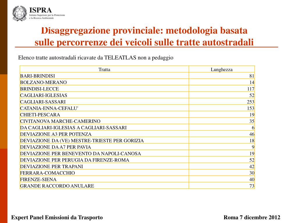 Disaggregazione provinciale: metodologia basata sulle percorrenze dei veicoli sulle tratte autostradali Elenco tratte autostradali ricavate da TELEATLAS non a pedaggio Expert Panel Emissioni da Trasporto Roma 7 dicembre 2012