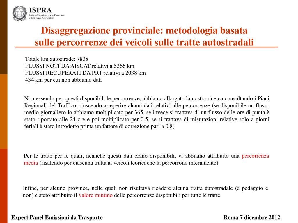 Disaggregazione provinciale: metodologia basata sulle percorrenze dei veicoli sulle tratte autostradali Totale km autostrade: 7838 FLUSSI NOTI DA AISCAT relativi a 5366 km FLUSSI RECUPERATI DA PRT relativi a 2038 km 434 km per cui non abbiamo dati Non essendo per questi disponibili le percorrenze, abbiamo allargato la nostra ricerca consultando i Piani Regionali del Traffico, riuscendo a reperire alcuni dati relativi alle percorrenze (se disponibile un flusso medio giornaliero lo abbiamo moltiplicato per 365, se invece si trattava di un flusso delle ore di punta è stato riportato alle 24 ore e poi moltiplicato per 0.5, se si trattava di misurazioni relative solo a giorni feriali è stato introdotto prima un fattore di correzione pari a 0.8) Per le tratte per le quali, neanche questi dati erano disponibili, vi abbiamo attribuito una percorrenza media (risalendo per ciascuna tratta ai veicoli teorici che la percorrono interamente) Infine, per alcune province, nelle quali non risultava ricadere alcuna tratta autostradale (a pedaggio e non) è stato attribuito il valore minimo delle percorrenze disponibili per tutte le tratte. Expert Panel Emissioni da Trasporto Roma 7 dicembre 2012