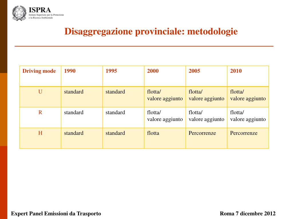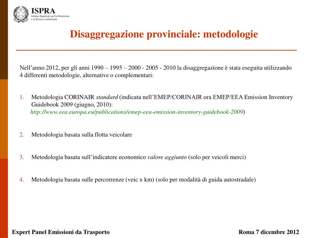 Disaggregazione provinciale: metodologie Nell’anno 2012, per gli anni 1990 – 1995 – 2000 - 2005 - 2010 la disaggregazione è stata eseguita utilizzando 4 differenti metodologie, alternative o complementari: Metodologia CORINAIR standard (indicata nell’EMEP/CORINAIR ora EMEP/EEA EmissionInventoryGuidebook 2009 (giugno, 2010): http://www.eea.europa.eu/publications/emep-eea-emission-inventory-guidebook-2009) 2. Metodologia basata sulla flotta veicolare 3. Metodologia basata sull’indicatore economico valore aggiunto (solo per veicoli merci) 4. Metodologia basata sulle percorrenze (veic x km) (solo per modalità di guida autostradale) Expert Panel Emissioni da Trasporto Roma 7 dicembre 2012