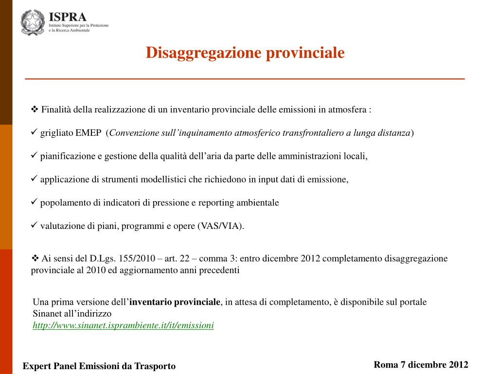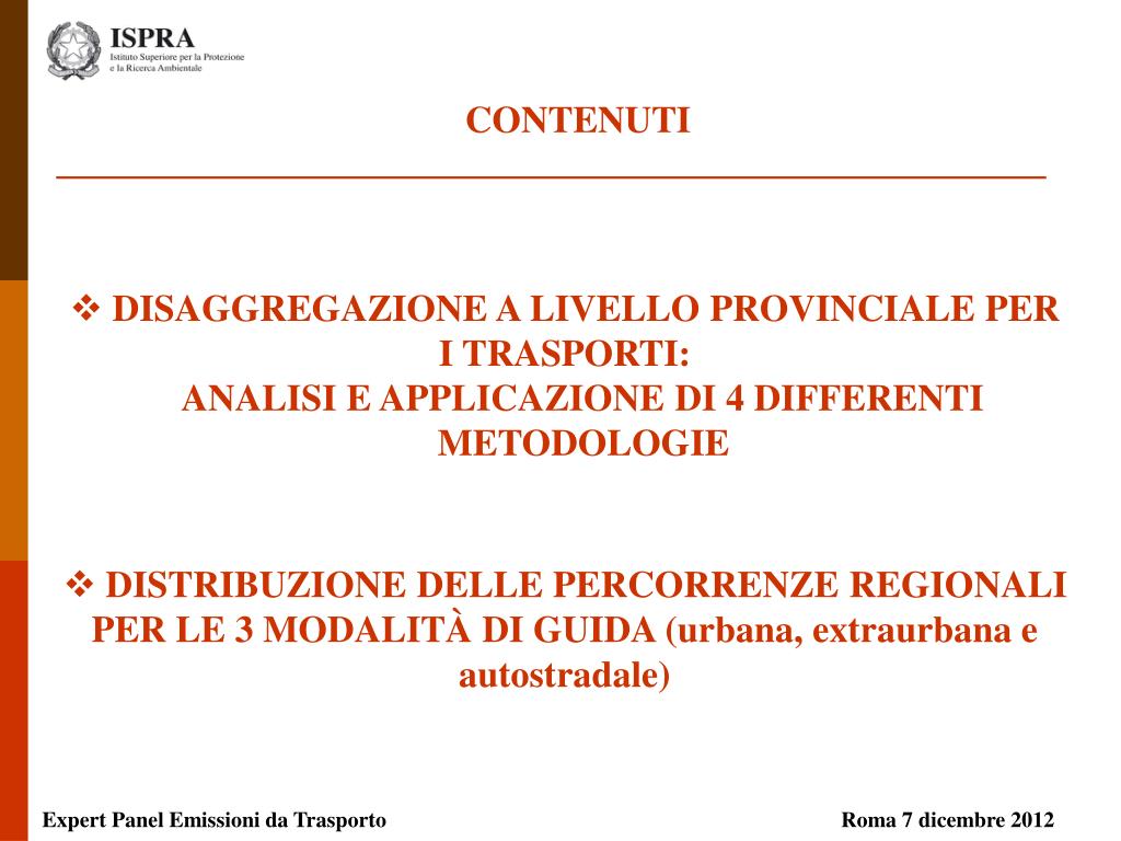 La disaggregazione provinciale delle emissioni nazionali da trasporto su strada nel 2010: metodologia e risultati Francesca Lena, Ernesto Taurino, Riccardo De Lauretis ISPRA. Expert Panel Emissioni da Trasporto. CONTENUTI. DISAGGREGAZIONE A LIVELLO PROVINCIALE PER I TRASPORTI: