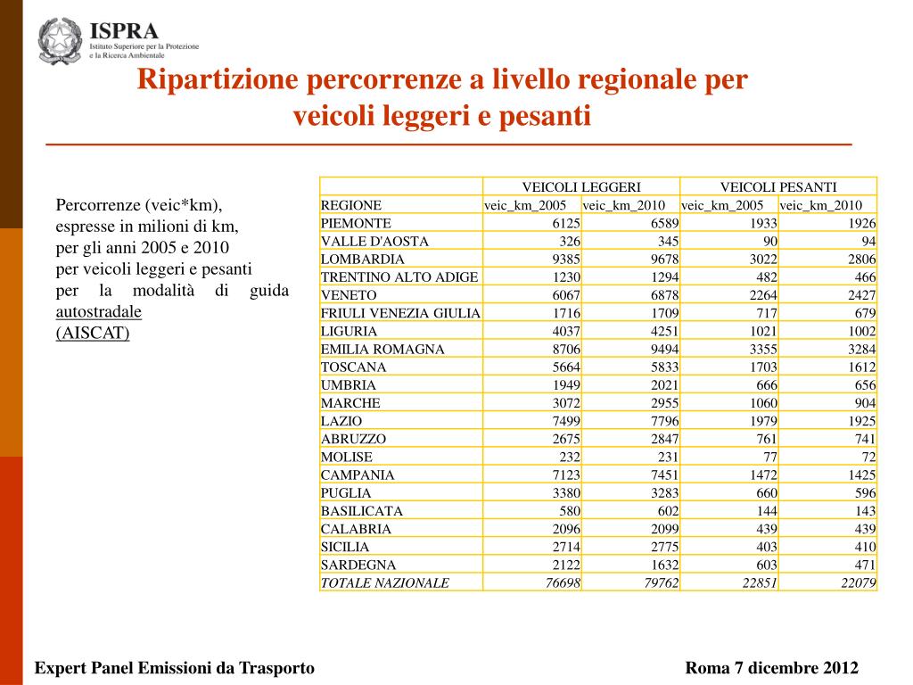 Ripartizione percorrenze a livello regionale per veicoli leggeri e pesanti Percorrenze (veic*km), espresse in milioni di km, per gli anni 2005 e 2010 per veicoli leggeri e pesanti per la modalità di guida autostradale (AISCAT) Expert Panel Emissioni da Trasporto Roma 7 dicembre 2012