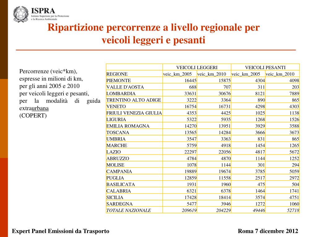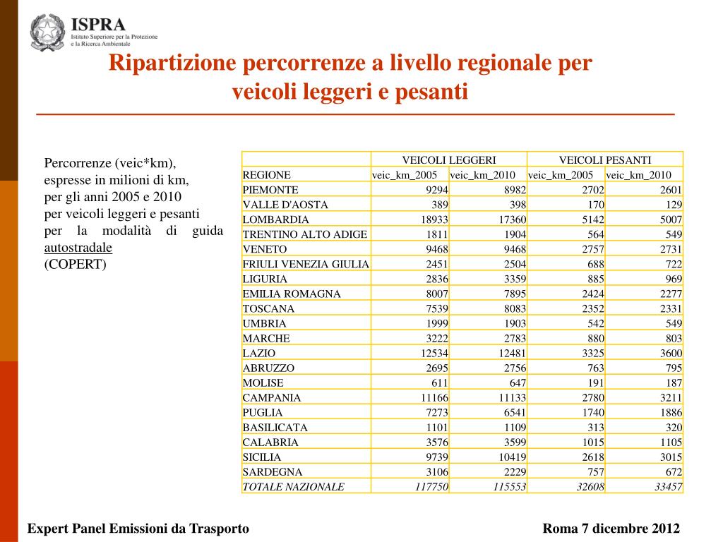 Ripartizione percorrenze a livello regionale per veicoli leggeri e pesanti Percorrenze (veic*km), espresse in milioni di km, per gli anni 2005 e 2010 per veicoli leggeri e pesanti per la modalità di guida autostradale (COPERT) Expert Panel Emissioni da Trasporto Roma 7 dicembre 2012