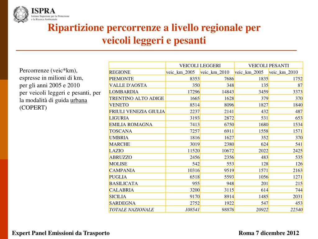 Ripartizione percorrenze a livello regionale per veicoli leggeri e pesanti Percorrenze (veic*km), espresse in milioni di km, per gli anni 2005 e 2010 per veicoli leggeri e pesanti, per la modalità di guida urbana (COPERT) Expert Panel Emissioni da Trasporto Roma 7 dicembre 2012
