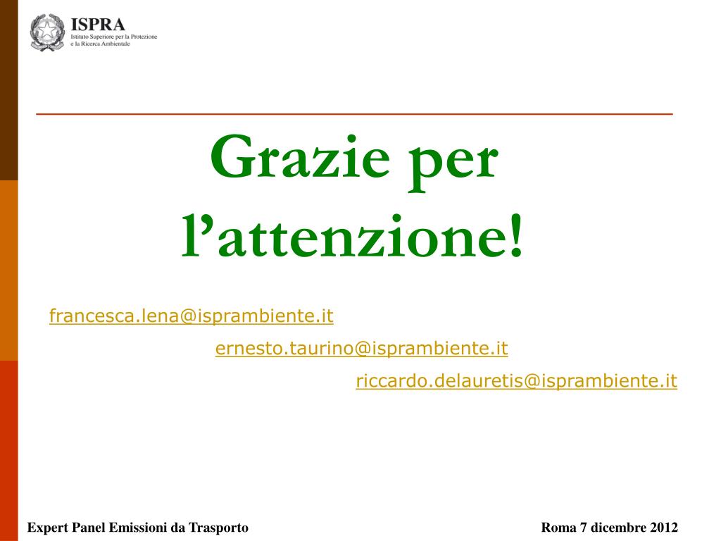 Grazie per l’attenzione! francesca.lena@isprambiente.it ernesto.taurino@isprambiente.it riccardo.delauretis@isprambiente.it Expert Panel Emissioni da Trasporto Roma 7 dicembre 2012