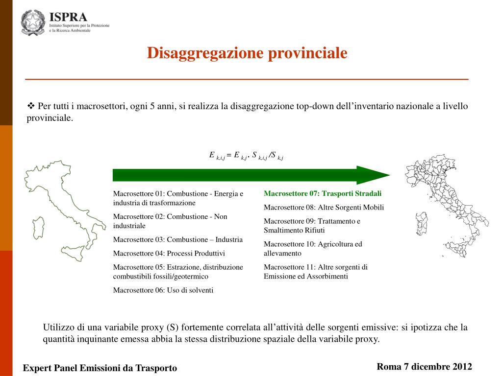 E k,i,j = E k,j . S k,i,j/S k,j Macrosettore 07: TrasportiStradali Macrosettore 08: AltreSorgentiMobili Macrosettore 09: Trattamento e SmaltimentoRifiuti Macrosettore 10: Agricolturaedallevamento Macrosettore 11: Altre sorgenti di Emissione ed Assorbimenti Macrosettore 01: Combustione - Energia e industria di trasformazione Macrosettore 02: Combustione - Non industriale Macrosettore 03: Combustione – Industria Macrosettore 04: ProcessiProduttivi Macrosettore 05: Estrazione, distribuzionecombustibilifossili/geotermico Macrosettore 06: Uso di solventi Disaggregazione provinciale • Per tuttiimacrosettori, ogni 5 anni, sirealizza la disaggregazione top-down dell’inventarionazionale a livelloprovinciale. Utilizzo di una variabile proxy (S) fortemente correlata all’attività delle sorgenti emissive: si ipotizza che la quantità inquinante emessa abbia la stessa distribuzione spaziale della variabile proxy. Roma 7 dicembre 2012 Expert Panel Emissioni da Trasporto
