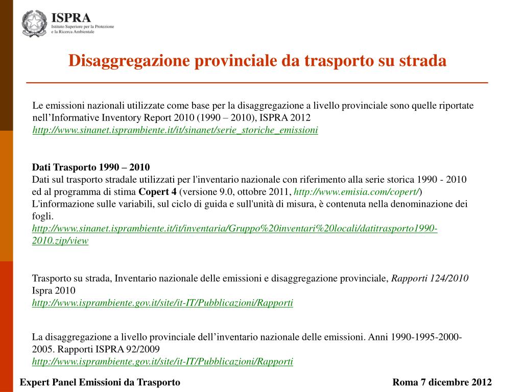 Disaggregazione provinciale da trasporto su strada Le emissioni nazionali utilizzate come base per la disaggregazione a livello provinciale sono quelle riportate nell’Informative Inventory Report 2010 (1990 – 2010), ISPRA 2012 http://www.sinanet.isprambiente.it/it/sinanet/serie_storiche_emissioni Dati Trasporto 1990 – 2010 Dati sul trasporto stradale utilizzati per l'inventario nazionale con riferimento alla serie storica 1990 - 2010 ed al programma di stima Copert 4 (versione 9.0, ottobre 2011, http://www.emisia.com/copert/) L'informazione sulle variabili, sul ciclo di guida e sull'unità di misura, è contenuta nella denominazione dei fogli. http://www.sinanet.isprambiente.it/it/inventaria/Gruppo%20inventari%20locali/datitrasporto1990-2010.zip/view Trasporto su strada, Inventario nazionale delle emissioni e disaggregazione provinciale, Rapporti 124/2010 Ispra 2010 http://www.isprambiente.gov.it/site/it-IT/Pubblicazioni/Rapporti La disaggregazione a livelloprovincialedell’inventarionazionaledelleemissioni. Anni 1990-1995-2000-2005. Rapporti ISPRA 92/2009 http://www.isprambiente.gov.it/site/it-IT/Pubblicazioni/Rapporti Roma 7 dicembre 2012 Expert Panel Emissioni da Trasporto