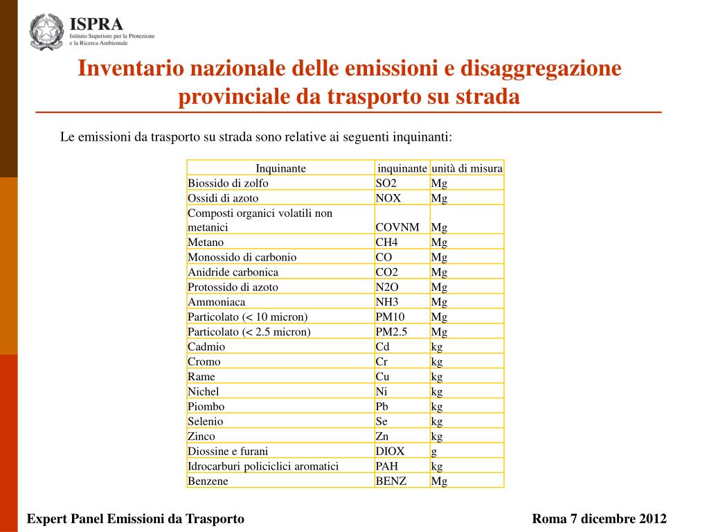 Inventario nazionale delle emissioni e disaggregazione provinciale da trasporto su strada Le emissioni da trasporto su strada sono relative ai seguenti inquinanti: Expert Panel Emissioni da Trasporto Roma 7 dicembre 2012