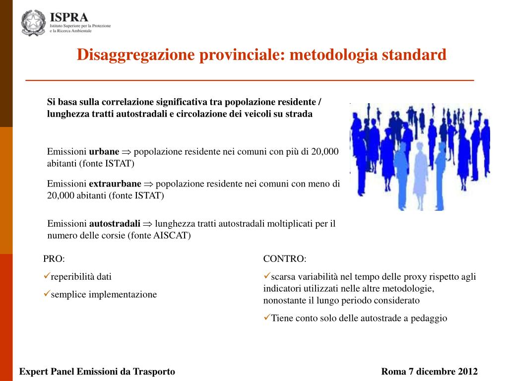 Disaggregazione provinciale: metodologia standard Si basa sulla correlazione significativa tra popolazione residente / lunghezza tratti autostradali e circolazione dei veicoli su strada Emissioni urbane popolazione residente nei comuni con più di 20,000 abitanti (fonte ISTAT) Emissioni extraurbane popolazione residente nei comuni con meno di 20,000 abitanti (fonte ISTAT) Emissioni autostradali lunghezza tratti autostradali moltiplicati per il numero delle corsie (fonte AISCAT) • PRO: • reperibilità dati • semplice implementazione • CONTRO: • scarsa variabilità nel tempo delle proxy rispetto agli indicatori utilizzati nelle altre metodologie, nonostante il lungo periodo considerato • Tiene conto solo delle autostrade a pedaggio Expert Panel Emissioni da Trasporto Roma 7 dicembre 2012