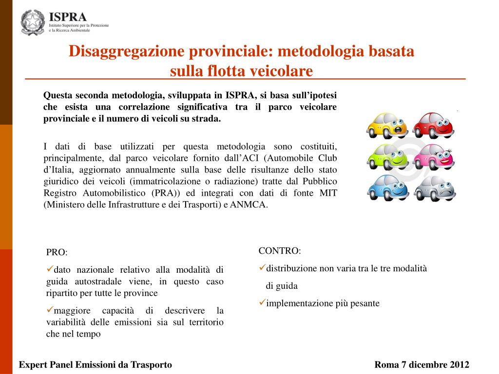 Disaggregazione provinciale: metodologia basata sulla flotta veicolare Questa seconda metodologia, sviluppata in ISPRA, si basa sull’ipotesi che esista una correlazione significativa tra il parco veicolare provinciale e il numero di veicoli su strada. I dati di base utilizzati per questa metodologia sono costituiti, principalmente, dal parco veicolare fornito dall’ACI (Automobile Club d’Italia, aggiornato annualmente sulla base delle risultanze dello stato giuridico dei veicoli (immatricolazione o radiazione) tratte dal Pubblico Registro Automobilistico (PRA)) ed integrati con dati di fonte MIT (Ministero delle Infrastrutture e dei Trasporti) e ANMCA. • CONTRO: • distribuzione non varia tra le tre modalità • di guida • implementazione più pesante • PRO: • dato nazionale relativo alla modalità di guida autostradale viene, in questo caso ripartito per tutte le province • maggiore capacità di descrivere la variabilità delle emissioni sia sul territorio che nel tempo Expert Panel Emissioni da Trasporto Roma 7 dicembre 2012