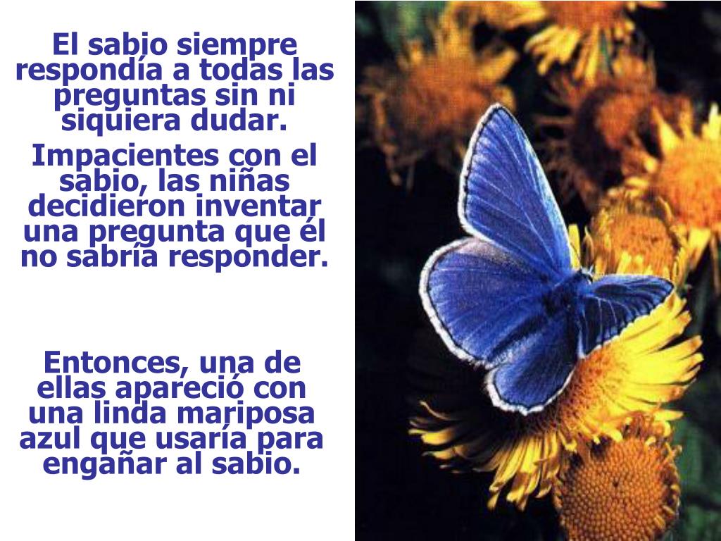 El sabio siempre respondía a todas las preguntas sin ni siquiera dudar. Impacientes con el sabio, las niñas decidieron inventar una pregunta que él no sabría responder. Entonces, una de ellas apareció con una linda mariposa azul que usaría para engañar al sabio.