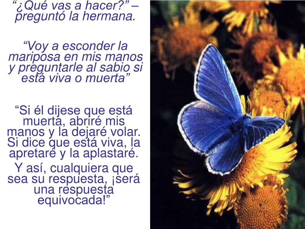 “¿Qué vas a hacer?” –preguntó la hermana. “Voy a esconder la mariposa en mis manos y preguntarle al sabio si está viva o muerta” “Si él dijese que está muerta, abriré mis manos y la dejaré volar. Si dice que está viva, la apretaré y la aplastaré. Y así, cualquiera que sea su respuesta, ¡será una respuesta equivocada!”