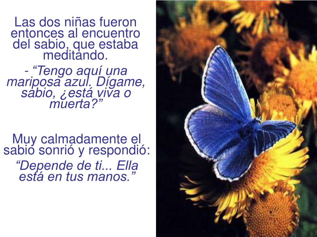 Las dos niñas fueron entonces al encuentro del sabio, que estaba meditando. - “Tengo aquí una mariposa azul. Dígame, sabio, ¿está viva o muerta?” Muy calmadamente el sabio sonrió y respondió: “Depende de ti... Ella está en tus manos.”