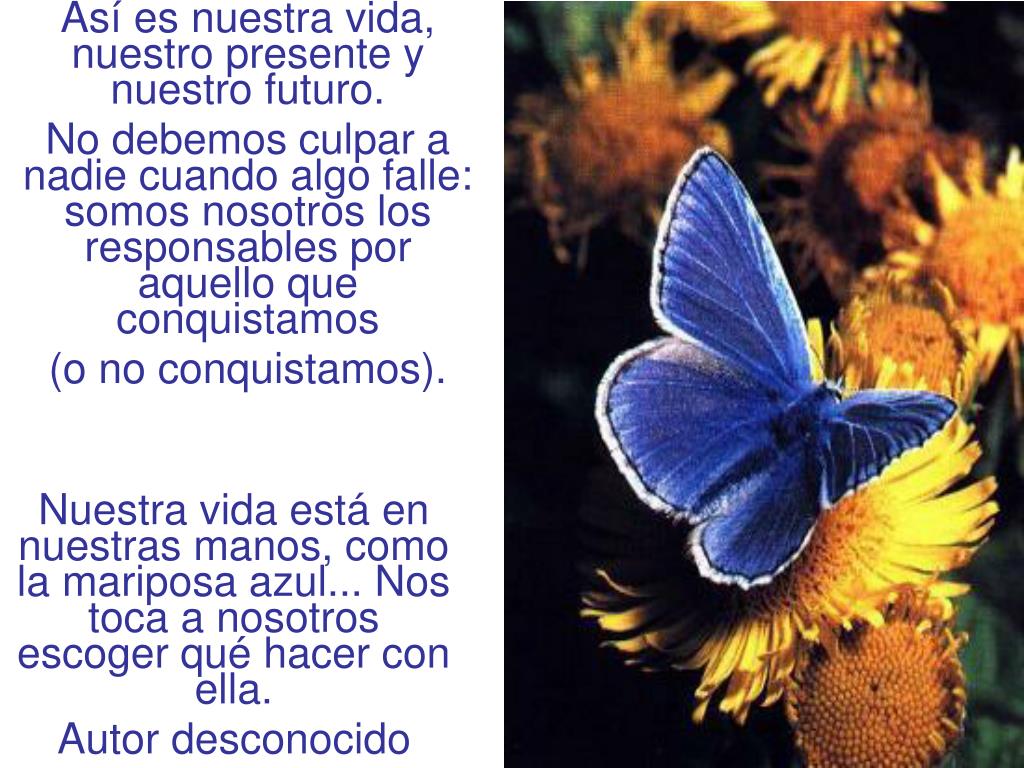 Así es nuestra vida, nuestro presente y nuestro futuro. No debemos culpar a nadie cuando algo falle: somos nosotros los responsables por aquello que conquistamos (o no conquistamos). Nuestra vida está en nuestras manos, como la mariposa azul... Nos toca a nosotros escoger qué hacer con ella. Autor desconocido