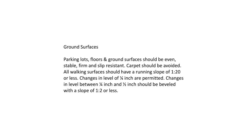 Ground Surfaces Parking lots, floors & ground surfaces should be even, stable, firm and slip resistant. Carpet should be avoided. All walking surfaces should have a running slope of 1:20 or less. Changes in level of ¼ inch are permitted. Changes in level between ¼ inch and ½ inch should be beveled with a slope of 1:2 or less.