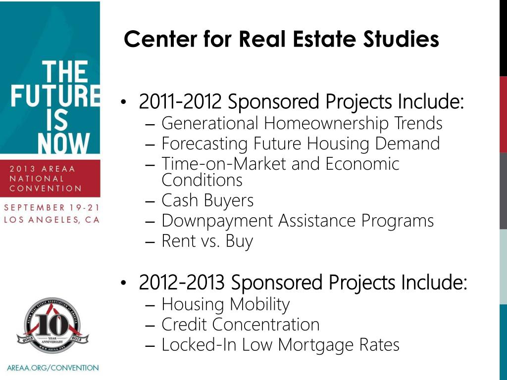 Center for Real Estate Studies • 2011-2012 Sponsored Projects Include: • Generational Homeownership Trends • Forecasting Future Housing Demand • Time-on-Market and Economic Conditions • Cash Buyers • Downpayment Assistance Programs • Rent vs. Buy • 2012-2013 Sponsored Projects Include: • Housing Mobility • Credit Concentration • Locked-In Low Mortgage Rates