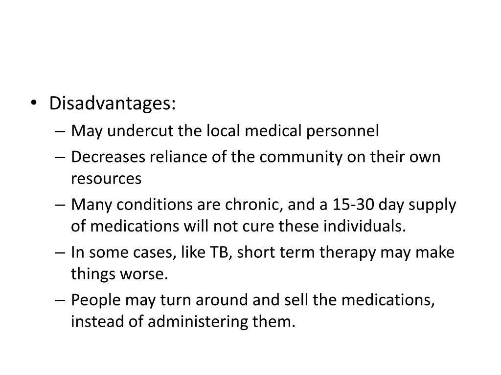 Disadvantages: • May undercut the local medical personnel • Decreases reliance of the community on their own resources • Many conditions are chronic, and a 15-30 day supply of medications will not cure these individuals. • In some cases, like TB, short term therapy may make things worse. • People may turn around and sell the medications, instead of administering them.