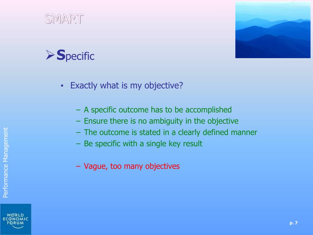 SMART • Specific • Exactly what is my objective? • A specific outcome has to be accomplished • Ensure there is no ambiguity in the objective • The outcome is stated in a clearly defined manner • Be specific with a single key result • Vague, too many objectives Performance Management
