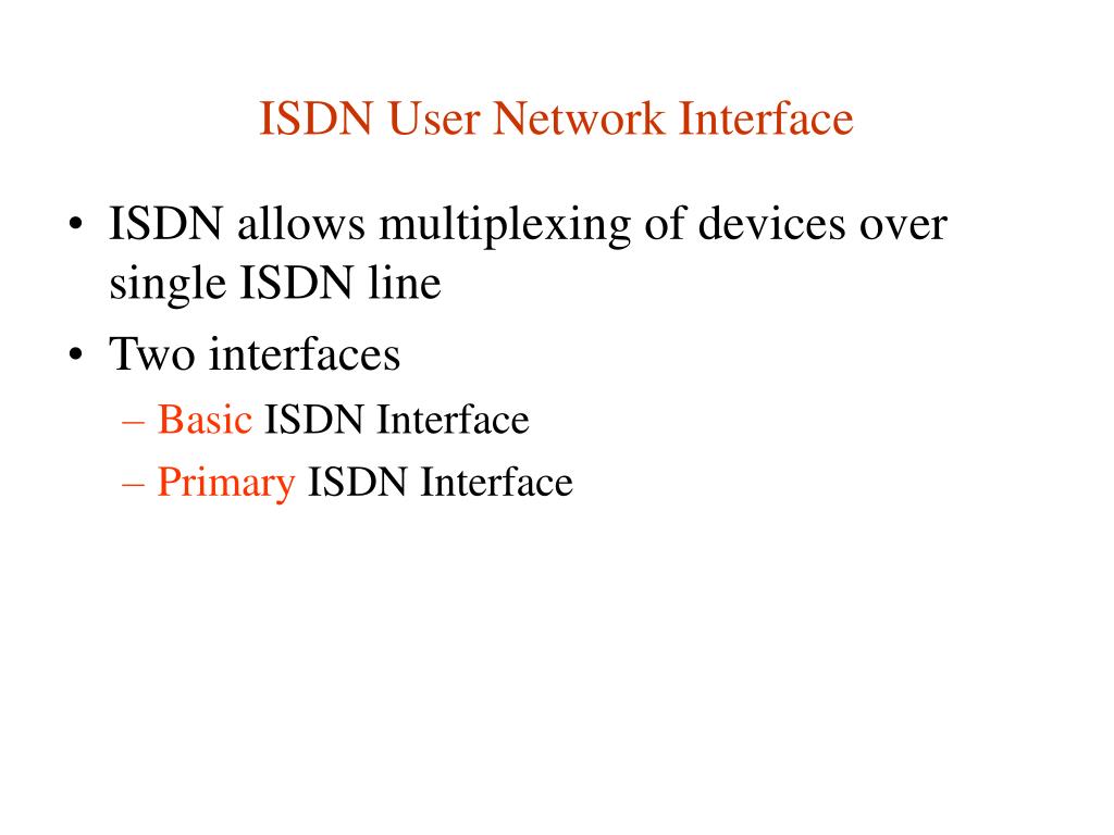 ISDN User Network Interface • ISDN allows multiplexing of devices over single ISDN line • Two interfaces • Basic ISDN Interface • Primary ISDN Interface