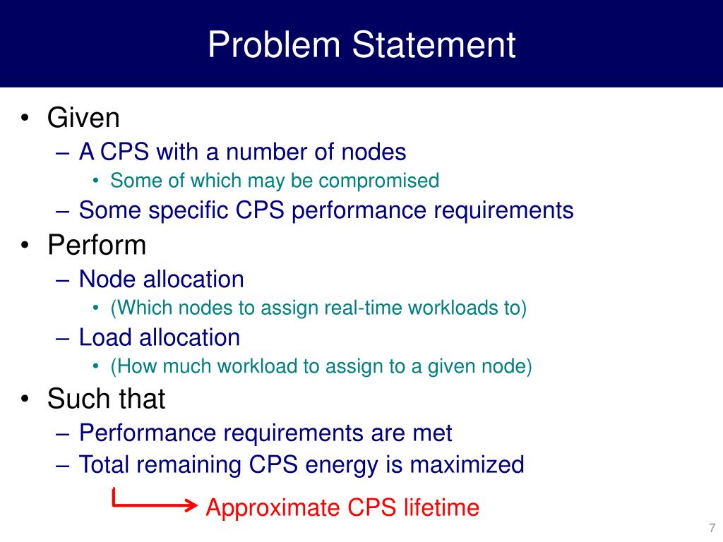 Problem Statement • Given • A CPS with a number of nodes • Some of which may be compromised • Some specific CPS performance requirements • Perform • Node allocation • (Which nodes to assign real-time workloads to) • Load allocation • (How much workload to assign to a given node) • Such that • Performance requirements are met • Total remaining CPS energy is maximized Approximate CPS lifetime