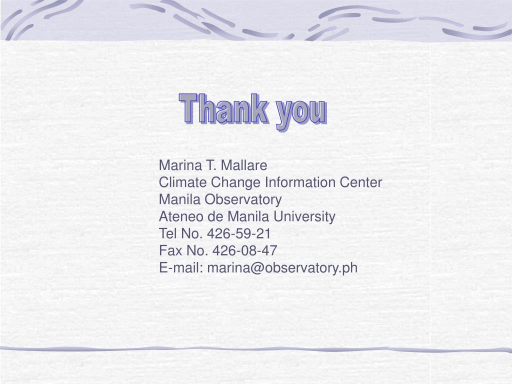 Thank you Marina T. Mallare Climate Change Information Center Manila Observatory Ateneo de Manila University Tel No. 426-59-21 Fax No. 426-08-47 E-mail: marina@observatory.ph