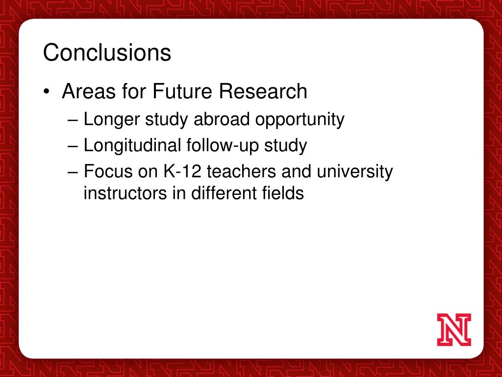 Conclusions • Areas for Future Research • Longer study abroad opportunity • Longitudinal follow-up study • Focus on K-12 teachers and university instructors in different fields