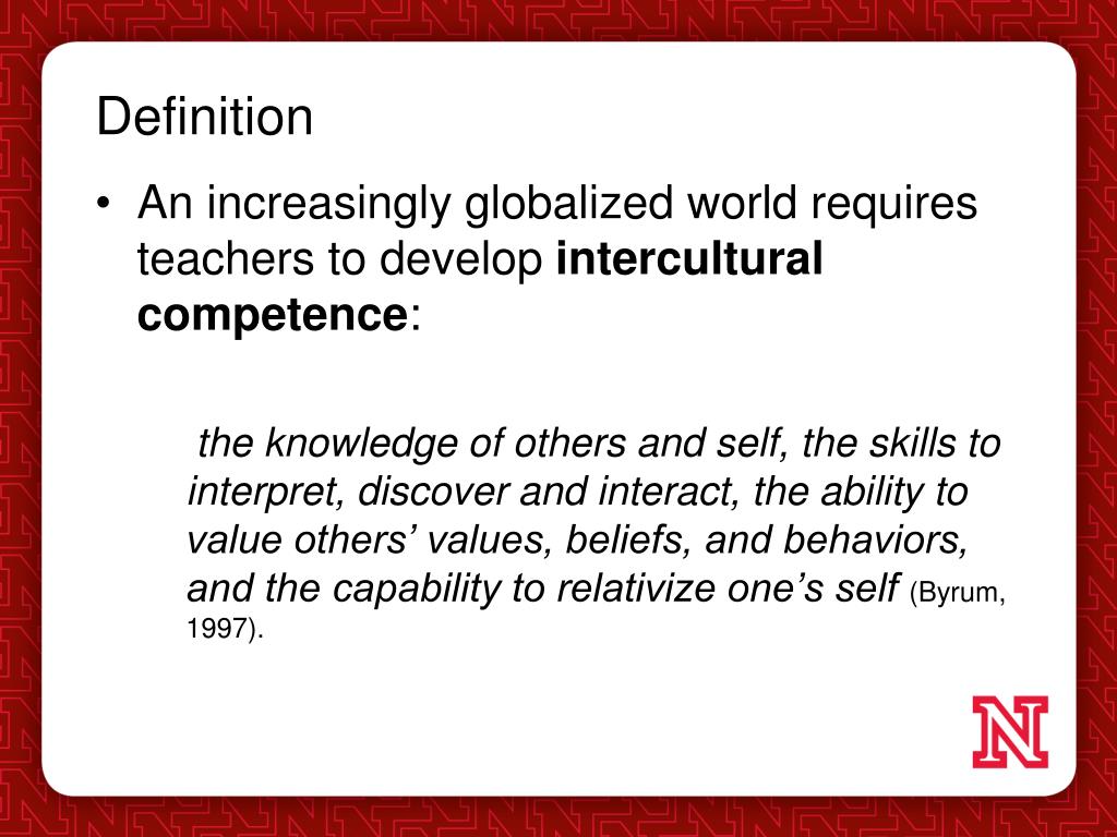 Definition • An increasingly globalized world requires teachers to develop intercultural competence: the knowledge of others and self, the skills to interpret, discover and interact, the ability to value others’ values, beliefs, and behaviors, and the capability to relativize one’s self (Byrum, 1997).