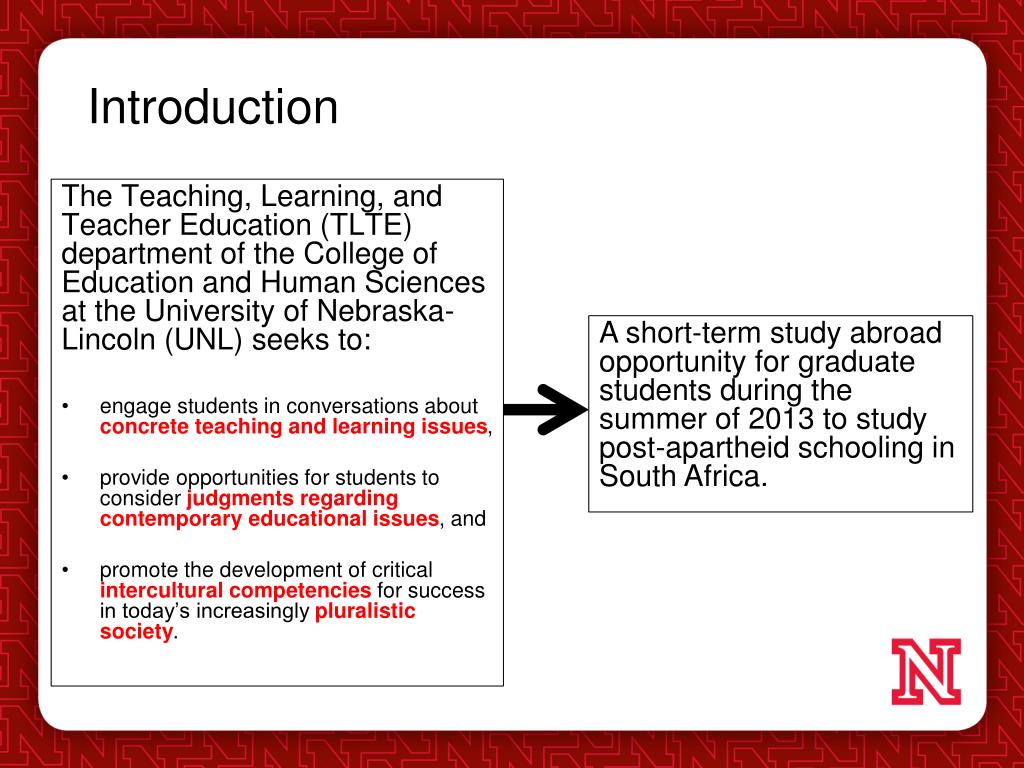 The Teaching, Learning, and Teacher Education (TLTE) department of the College of Education and Human Sciences at the University of Nebraska-Lincoln (UNL) seeks to: engage students in conversations about concrete teaching and learning issues, provide opportunities for students to consider judgments regarding contemporary educational issues, and promote the development of critical intercultural competencies for success in today’s increasingly pluralistic society. Introduction A short-term study abroad opportunity for graduate students during the summer of 2013 to study post-apartheid schooling in South Africa.