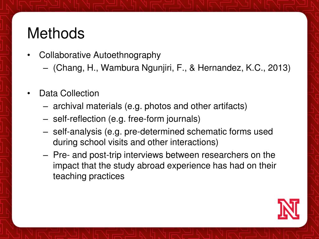 Methods • Collaborative Autoethnography • (Chang, H., WamburaNgunjiri, F., & Hernandez, K.C., 2013) • Data Collection • archival materials (e.g. photos and other artifacts) • self-reflection (e.g. free-form journals) • self-analysis (e.g. pre-determined schematic forms used during school visits and other interactions) • Pre- and post-trip interviews between researchers on the impact that the study abroad experience has had on their teaching practices