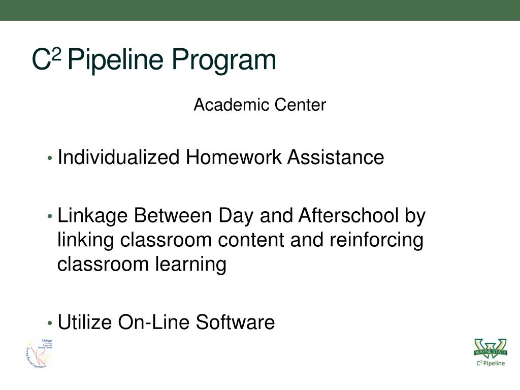 C2 Pipeline Program Academic Center • Individualized Homework Assistance • Linkage Between Day and Afterschool by linking classroom content and reinforcing classroom learning • Utilize On-Line Software