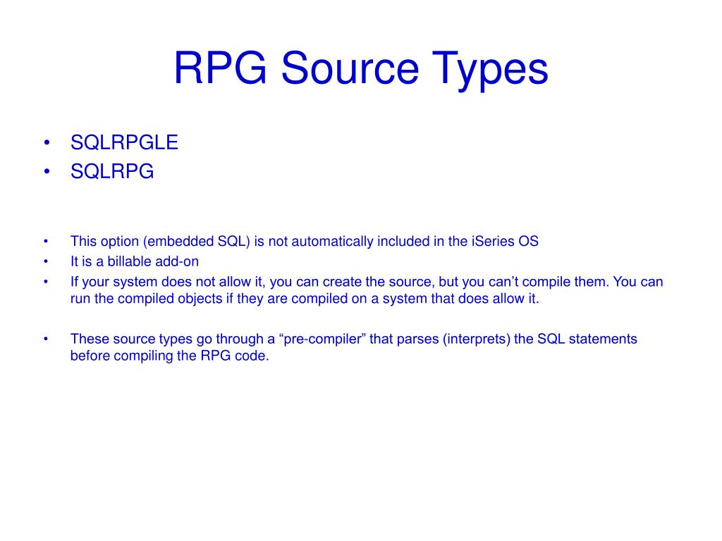 RPG Source Types • SQLRPGLE • SQLRPG • This option (embedded SQL) is not automatically included in the iSeries OS • It is a billable add-on • If your system does not allow it, you can create the source, but you can’t compile them. You can run the compiled objects if they are compiled on a system that does allow it. • These source types go through a “pre-compiler” that parses (interprets) the SQL statements before compiling the RPG code.