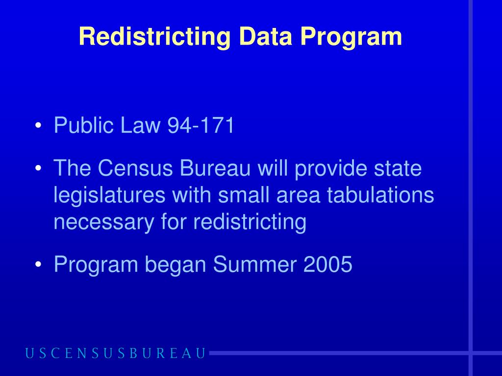 Redistricting Data Program • Public Law 94-171 • The Census Bureau will provide state legislatures with small area tabulations necessary for redistricting • Program began Summer 2005